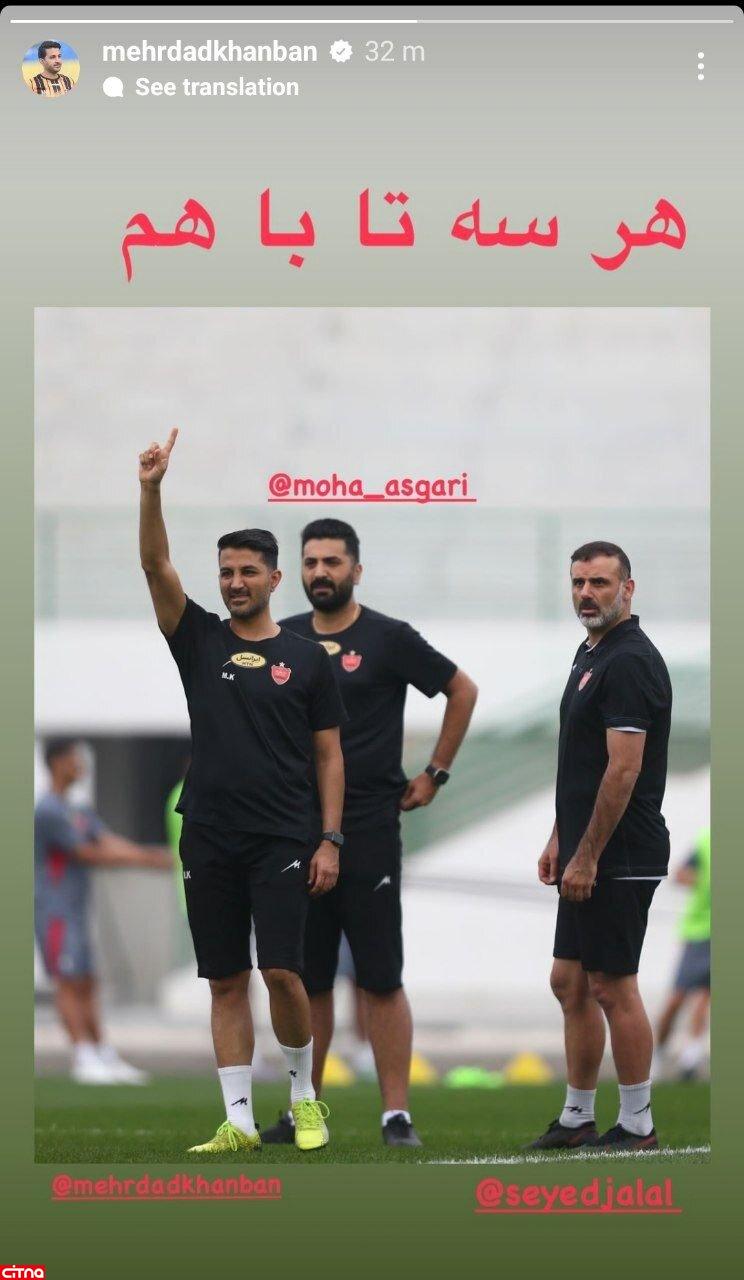 حال پس از اینکه محمد عسگری، آنالیزور و دستیار یحیی اعلام کرد از پرسپولیس جدا میشود و شایعاتی در خصوص جدایی مهرداد خانبان، دیگر آنالیزور پرسپولیس وجود داشت حالا خانبان در استوری اینستاگرامش با انتشار تصویری از خود، عسگری و سیدجلال نوشت: هر سه تا باهم.