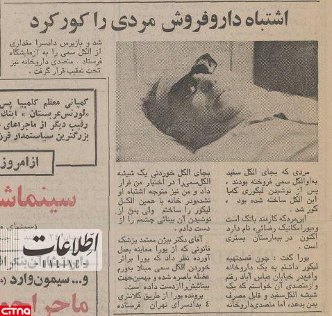 به گزارش سیتنا، رسانههای تهران اسفند ۱۳۵۲ از کور شدن کارمند بانکی نوشتند که برای تهیه یک مشروب خاص با ترکیب الکل سفید بینایی خود را از دست داد. روزنامه اطلاعات اول اسفند ۱۳۵۲ خبر عرضه اشتباه الکل سمی به جای الکل سفید در یک داروخانه خیابان عباس آباد تهران را منتشر کرد. خبر را بخوانید و عکس مرد نابینا شده را تماشا کنید.