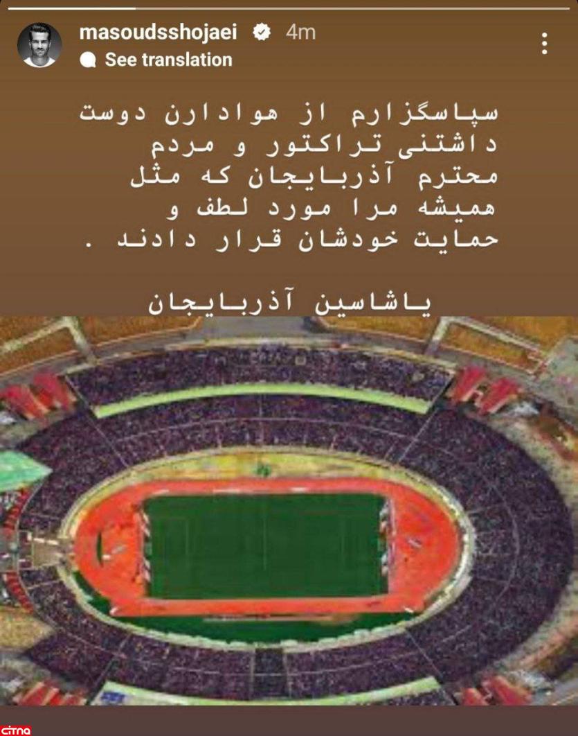 مربی تیم هوادار تهران پس بازی تیمش در برابر تراکتور، طی یک استوری از هواداران تیم تراکتور تشکر کرد.