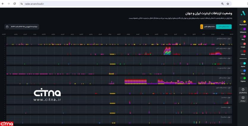رادارهای ابر آروان از بروز اختلال شدید در شبکه اینترنت کشور خبر میدهد و این اختلال در رادار دیتاسنترهای مختلفی مانند دیتاسنتر افرانت، شاتل، پارس آنلاین، مبیننت و... نیز مشاهده میشود.