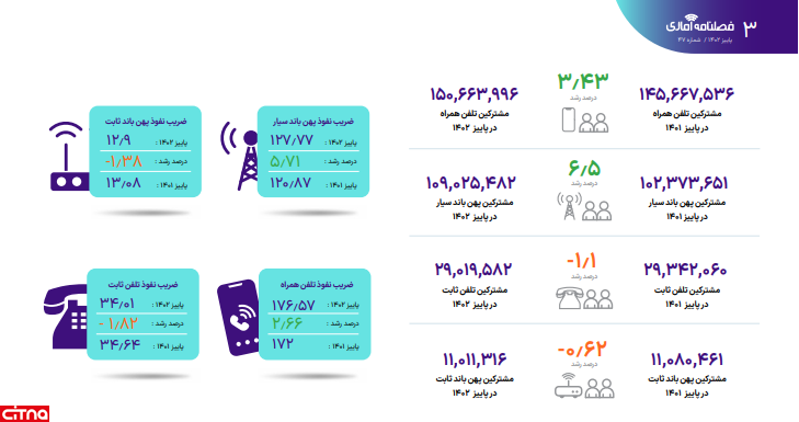 بر اساس این گزارش ضریب نفوذ اینترنت پهن باند ثابت از ۱۳/۰۸ درصد در پاییز سال ۱۴۰۱ به ۱۲/۹ درصد در پاییز سال ۱۴۰۲ رسیده است، همچنین ضریب نفوذ پهن باند سیار در پاییز سال 1401 از ۱۲۰/۸۷ به ۱۲۷/۷۷ پاییز در سال گذشته رسیده است که نشان از رشد ۵/۷۱ درصدی در این حوزه دارد.