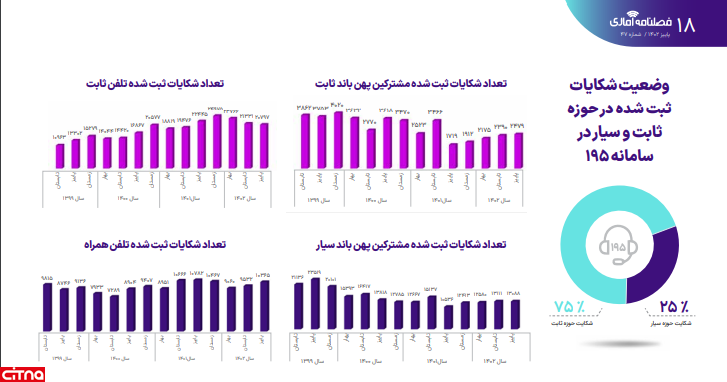 در بخش دیگری از این گزارش به وضعیت شکایت ثبت شده در حوزه ثابت و سیار در سامانه ۱۹۵ هم پرداخته شده است که ۷۵ درصد شکایت ها متعلق به حوزه ثابت بوده و ۲۵ درصد شکایتها به حوزه سیار تعلق دارد.
