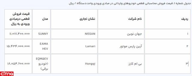 همچنین نیسان سانی (بنزینی) و لاماریایما هیبریدی در این دور از فروش خودروهای وارداتی عرضه شدهاند.