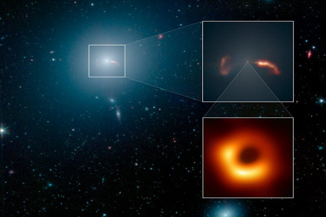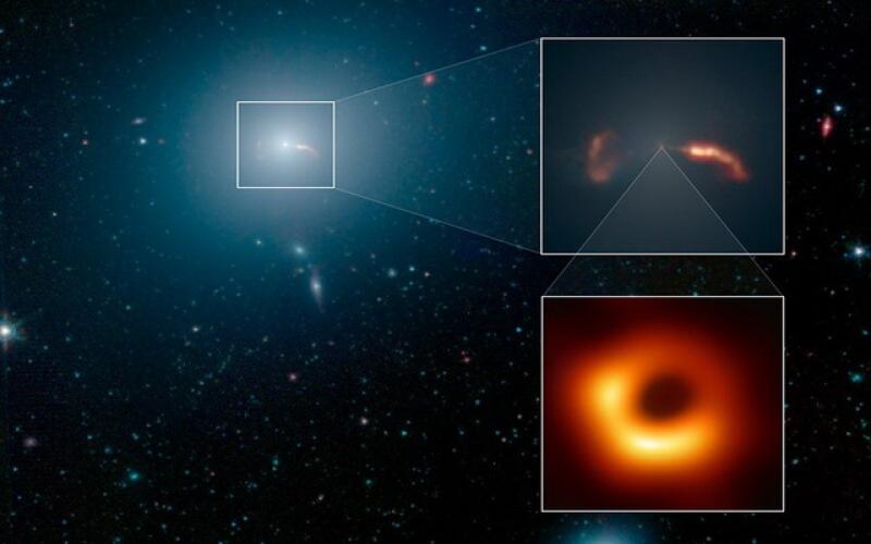در تصویر بزرگشده پایین-راست، تصویر تاریخی اولین سیاهچاله را میبینید که بین فوارههای نسبیتی در مرکز کهکشان غولپیکر واقع شده است. این سیاهچاله عظیم که نشان مستقیمی از آن در تصویر اسپیتزر دیده نمیشود، با مواد در حال سقوط احاطه شده و منبع انرژی عظیمی است که جتهای نسبیتی را از مرکز کهکشان فعال M87 به فضای میانکهکشانی پرتاب میکند.