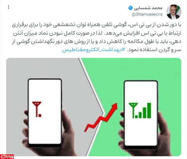 مدیرکل تنظیم مقررات و ارتباطات رادیویی منطقه شمال شرق رگولاتوری گفت: در صورت کامل نبودن نماد میزان آنتن دهی، باید یا طول مکالمه را کاهش داد و یا از روش های دور نگهداشتن گوشی از سر و گردن استفاده کرد.