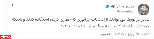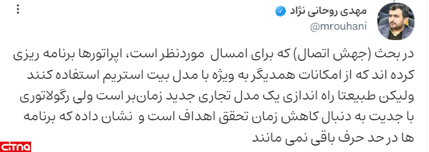 همچنین روحانی نژاد، معاون راهبردی و توسعه بازار رگولاتوری در پاسخ به کاربر دیگری، مطرح کرد: در بحث (جهش اتصال) که برای امسال موردنظر است، اپراتورها برنامه ریزی کرده اند که از امکانات همدیگر به ویژه با مدل بیت استریم استفاده کنند، ولیکن طبیعتا راه اندازی یک مدل تجاری جدید زمانبر است، ولی رگولاتوری با جدیت به دنبال کاهش زمان تحقق اهداف است و نشان داده که برنامه ها در حد حرف باقی نمی مانند.