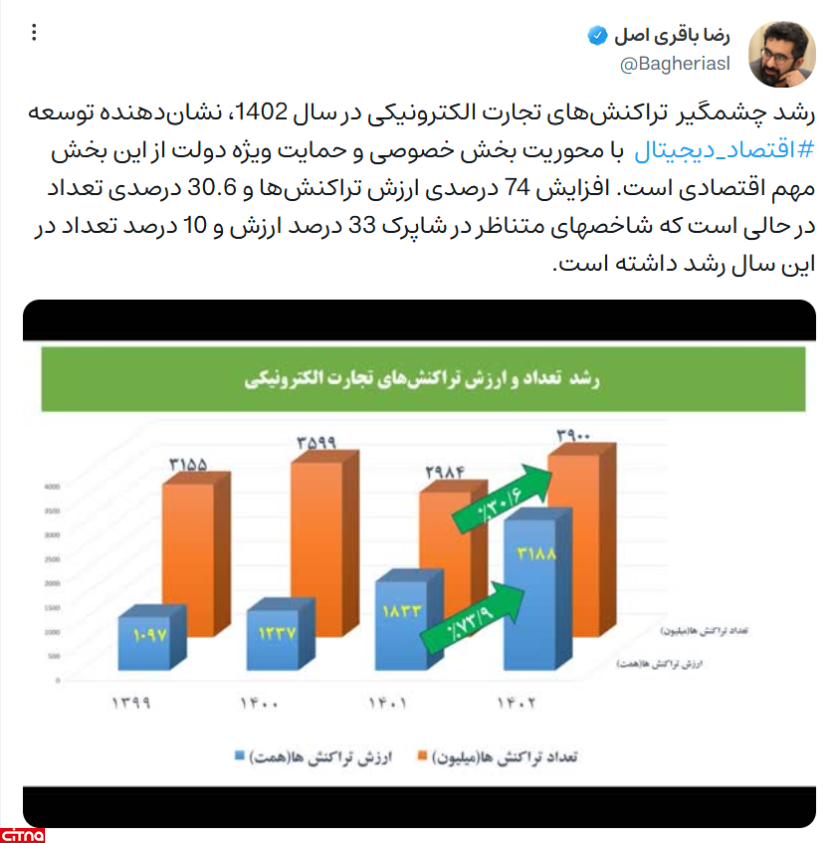 رشد چشمگیر تراکنشهای تجارت الکترونیکی در سال 1402، نشاندهنده توسعه اقتصاد دیجیتال با محوریت بخش خصوصی و حمایت ویژه دولت از این بخش مهم اقتصادی است.