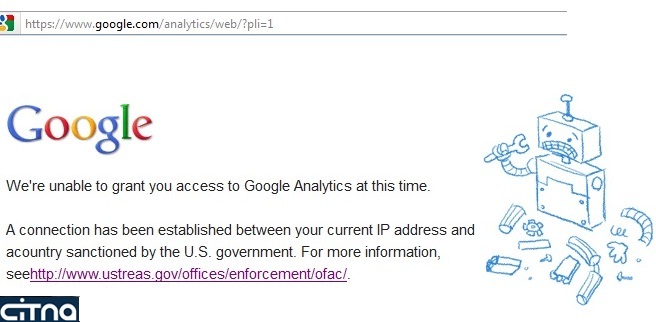 به گزارش سیتنا (citna.ir)، کاربرانی که با آی پی ایران به سرویس google analytics مراجعه میکردند از روز گذشته با عدم دسترسی به این سرویس گوگل مواجه شدهاند و پیغامی مبنی بر اینکه آی پی آدرس شما در محدودهی کشور تحت تخریم دولت آمریکا قرار دارد مواجه میشوند.