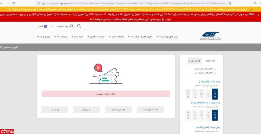 این در حالی است که سایت فروش بلیت قطارهای مسافری رجا از ساعت هشت صبح امروز دچار اختلال شده است. با وجود این اختلال بیش از نیم ساعته، سایت مذکور در مراجعه مردم پیام فروش تمام بلیتها را نشان میدهد.