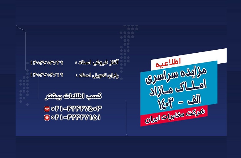 مشتریان املاک و ذی نفعان مزایده، می توانند با کلیک روی اسناد مزایده و لیست املاک اطلاعات مزایده را دریافت و یا با شماره تلفن های ۴۲۴۲۷۵۰۳-۰۲۱ و ۴۲۴۲۷۱۵۱-۰۲۱ شرکت مخابرات ایران تماس حاصل کنند.