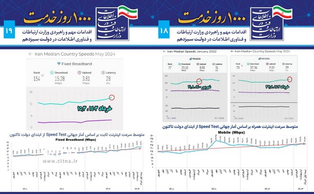 اقدامات ذکر شده در گزارش قبل و دهها اقدام دیگر در توسعه زیرساختهای ارتباطی که عرض خواهد شد، باعث شد تا به استناد داشبوردهای جهانی که امروز منتشر شد، سرعت اینترنت همراه و ثابت به ترتیب 71 و 65 درصد نسبت به شهریور 1400و حدود 20 درصد نسبت به دی ماه گذشته ارتقا یابد.