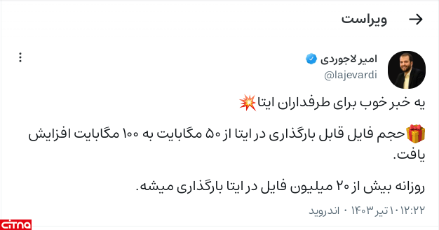 حجم فایل قابل بارگذاری در ایتا از ۵۰ مگابایت به ۱۰۰ مگابایت افزایش یافت.