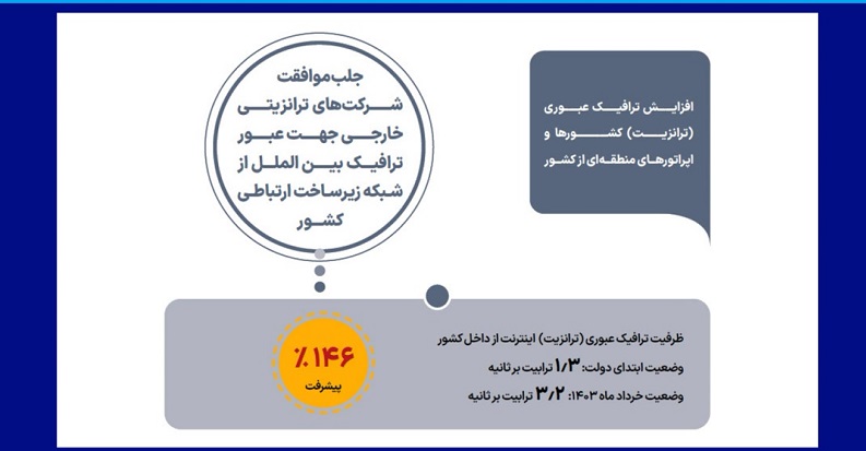 کشورمان موقعیت ویژهای برای ترانزیت اینترنت در منطقه دارد که در گذشته از آن غفلت شده است. با توسعه تعاملات بین المللی و مزیت بخشی به مسیرهای ترانزیتی کشور، میزان اینترنت ترانزیت شده از خاک کشورمان 2.5 برابر شده و طبق برنامه انشاءالله تا پایان سال به چهار ترابیت بر ثانیه خواهد رسید.