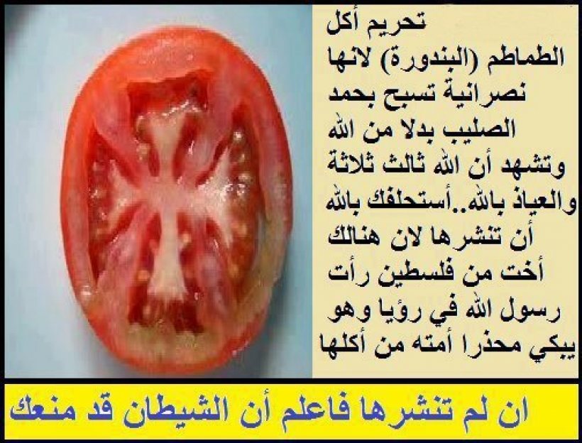 به گزارش سیتنا به نقل از جام نیوز، این گروه با گذاشتن عکسی از گوجه فرنگی در صفحه فیس بوک خود، نوشتند: «گوجه فرنگی مسیحی است چرا که وقتی گوجه فرنگی را بطور عمودی برش می دهیم، در وسط آن یک صلیب می بینیم بنابراین گوجه فرنگی بجای پرستش خداوند، صلیب را می پرستد. صلیبی که بجای خداوند واحد به وجود 3 خدا معتقد است. بنابراین خوردن گوجه فرنگی حرام است.»