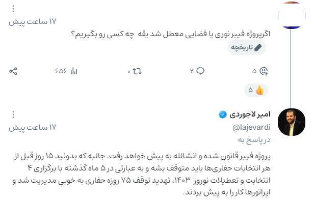 به گزارش سیتنا، امیر لاجوردی در شبکه اجتماعی ویراستی در پاسخ به سوال یک کاربر پیرامون احتمال معطل ماندن پروژه فیبرنوری و فضایی گفت:
