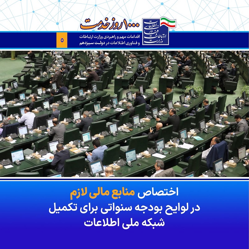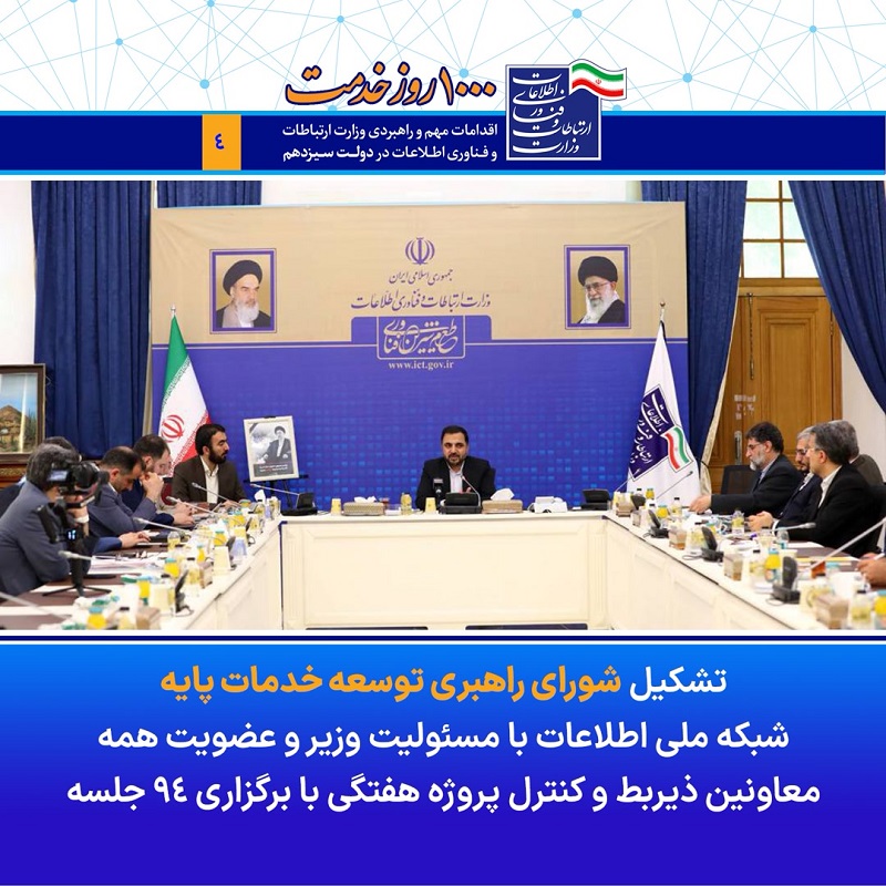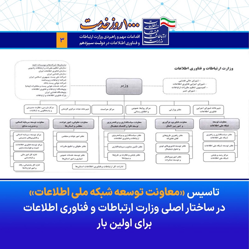 تاسیس «معاونت توسعه شبکه ملی اطلاعات» در وزارتخانه، تشکیل «شورای راهبری توسعه شبکه ملی اطلاعات» با مسئولیت وزیر و برگزاری 270جلسه این شورا و شوراهای اقماریش و تامین منابع مالی و زیرساخت های حقوقی مربوطه از جمله ریل گذاری های صورت گرفته برای تحقق شبکه ملی اطلاعات در این دوره است.