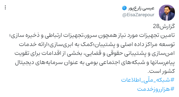 به گزارش سیتنا، دکتر عیسی زارع پور در بیستوهشتمین گزارش 1000 روز خدمت دولت سیزدهم در توسعه زیرساختهای ارتباطی اعلام کرد: