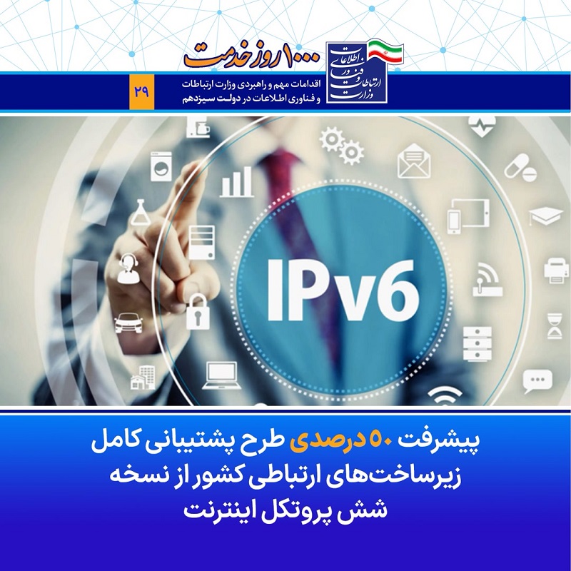پیشرفت 50 درصدی طرح پشتیبانی کامل زیرساخت های ارتباطی کشور از نسخه6 پروتکل اینترنت(IPv6) و بهره برداری از زیرساخت خدمات ابری «ابر ایران» در 9 نقطه کشور با مشارکت بخش خصوصی برای ارائه خدمات ابری به خدمات و سکوهای ایرانی، از دیگر اقدامات انجام شده برای تکمیل شبکه است.