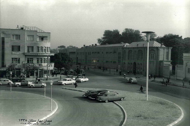 تصاویر از میدان بهارستان برای سال ۱۳۳۸ از مجموعه عکسهای پاکزاد است، تردد خودروهای کلاسیک و بدون ترافیک بودن بهارستان در این تصاویر توجه را جلب میکند.