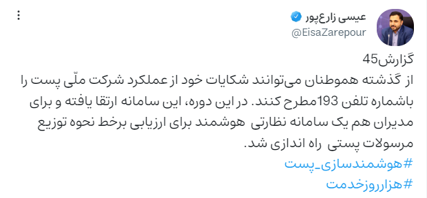 از گذشته هموطنان میتوانند شکایات خود از عملکرد شرکت ملی پست را با شماره تلفن 193 مطرح کنند. در این دوره، این سامانه ارتقا یافته و برای مدیران هم یک سامانه نظارتی هوشمند برای ارزیابی برخط نحوه توزیع مرسولات پستی راه اندازی شد.