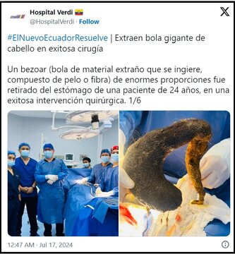 جراحان در اکوادور موفق شدند یک زن ۲۴ ساله را از یک وضعیت بحرانی نجات داده و در طی یک عمل جراحی ۴۵ دقیقهای، یک توده بزرگ مو را از شکم او خارج کنند.