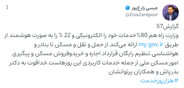 وزارت راه هم 80 درصد خدمات خود را الکترونیکی و 22 درصد را به صورت هوشمند از طریق my.gov.ir ارائه میکند. از حمل و نقل و مسکن تا بنادر و هواشناسی. تنظیم رایگان قرارداد اجاره و خریدوفروش مسکن و پیگیری امور مسکن ملی از جمله خدمات کاربردی این روزهاست. خداقوت به دکتر بذرپاش و همکاران پرتوانشان.