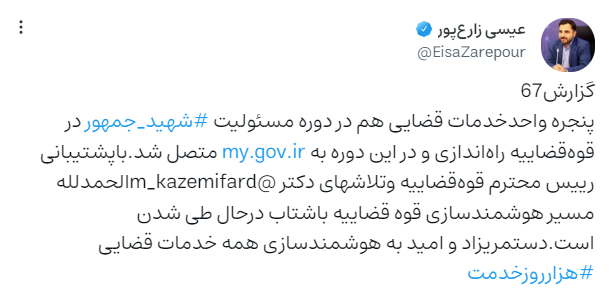 پنجره واحد خدمات قضایی هم در دوره مسئولیت شهید جمهور در قوه قضاییه راهاندازی و در این دوره به my.gov.ir متصل شد. با پشتیبانی رییس محترم قوه قضاییه و تلاشهای دکتر کاظمی فرد الحمدلله مسیر هوشمندسازی قوه قضاییه با شتاب در حال طی شدن است. دستمریزاد و امید به هوشمندسازی همه خدمات قضایی.