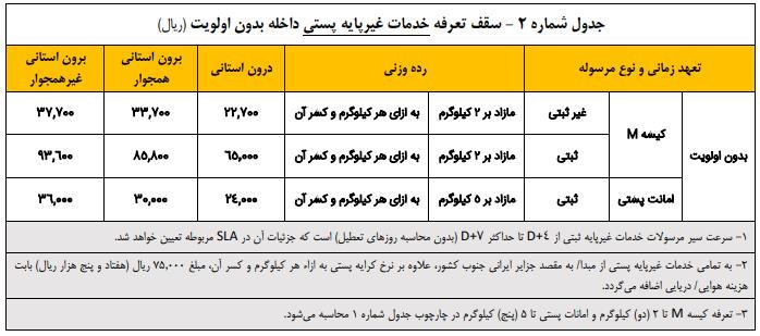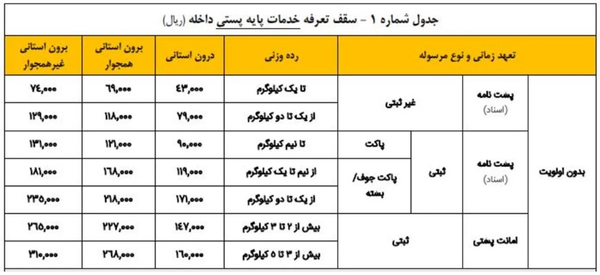 خدمات شرکت ملی پست بر اساس مصوبه ستاد تنظیم بازار از اول مرداد 1403 نرخنامه جدید خود را اجرایی کرده که به موجب آن تعرفه پایه خدمات پستی با پنج درصد نوسان، 30 درصد افزایش و خدمات غیر پایه نیز با 10 درصد نوسان، 35 درصد افزایش یافته است، همچنین جدای از تعرفه پایه، بیمه کالا نیز جزو بخشهایی است که در نرخنامه جدید افزایش قیمت داشته است.