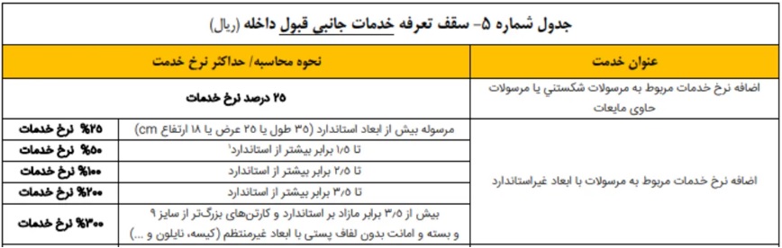 در نرخنامه جدید شرکت پست، اضافه شدن معیار «وزن حجمی» برای محاسبه و تعیین تعرفه پستی در بخش خدمات جانبی وجود دارد. در حالی که پیش از این هزینه ارسال مرسولات پستی با در نظر گرفتن وزن مرسوله و مقصد مشخص میشد اما طبق تصمیمات جدید شرکت ملی پست از این به بعد وزن حجمی نیز در هزینه ارسال پستی تأثیرگذار است. مرسولههای پستی که بزرگتر از ابعاد استاندارد تعیینشده توسط پست باشند، ۲۵ تا ۳۰۰ درصد بیشتر از نرخ پایه، هزینه ارسال خواهند داشت.