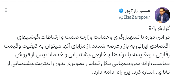 در این دوره با تسهیلگری و حمایت وزارت صمت و ارتباطات، گوشیهای اقتصادی ایرانی به بازار عرضه شدند. از مزایای آنها میتوان به کیفیت و قیمت رقابتی در مقایسه با برندهای خارجی، پشتیبانی و خدمات پس از فروش مناسب، ارائه سرویسهایی مثل تماس تصویری بدون اینترنت، پشتیبانی از 5G و...اشاره کرد. این راه ادامه دارد.