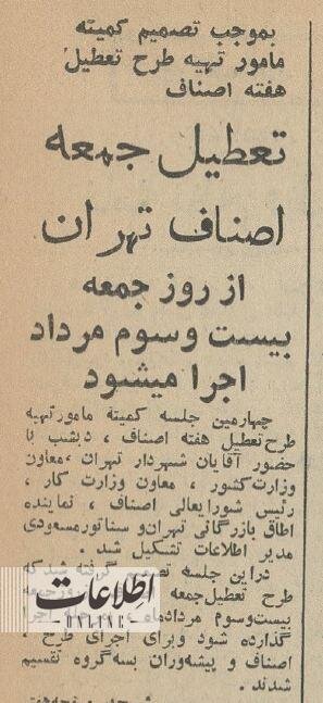 همچنین اعلام شد که از جمعه ۲۳ مرداد همه اصناف مکلف به رعایت تعطیلی روز جمعه هستند. گفتنی است که تا قبل از این تاریخ تعطیلی روز جمعه را بخش دولتی رعایت میکرد و مغازهداران و صنوف مختلف درباره روز تعطیلی هفته توافقی نداشتند. این خبر را به نقل از روزنامه اطلاعات ۱۲ مرداد ۱۳۴۳ و ۲۴ مرداد ۱۳۴۳ بخوانید و عکسهای جلسه و اولین تعطیلی رسمی جمعه را تماشا کنید.