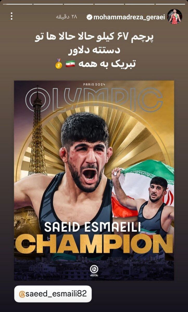 گرایی با انتشار متنی برای اسماعیلی نوشت: پرچم ۶۷ کیلو حالا حالا تو دستته دلاور. تبریک به همه.