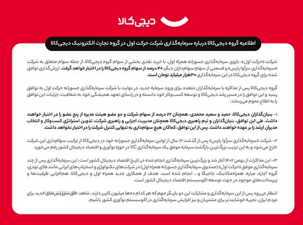 دیجی کالا در اطلاعیهای اعلام کرد: به دنبال مذاکراتی که از بهمن ماه ۱۴۰۲ آغاز شده بود، بازوی سرمایهگذاری جسورانه همراه اول، ۴۰ درصد از سهام گروه دیجیکالا را در اختیار گرفت و بزرگترین سرمایهگذاری انجام شده در تاریخ اقتصاد دیجیتال کشور رقم خورد که ارزشگذاری توافق شده برای گروه دیجیکالا در این سرمایهگذاری ۳۰ هزار میلیارد تومان است.