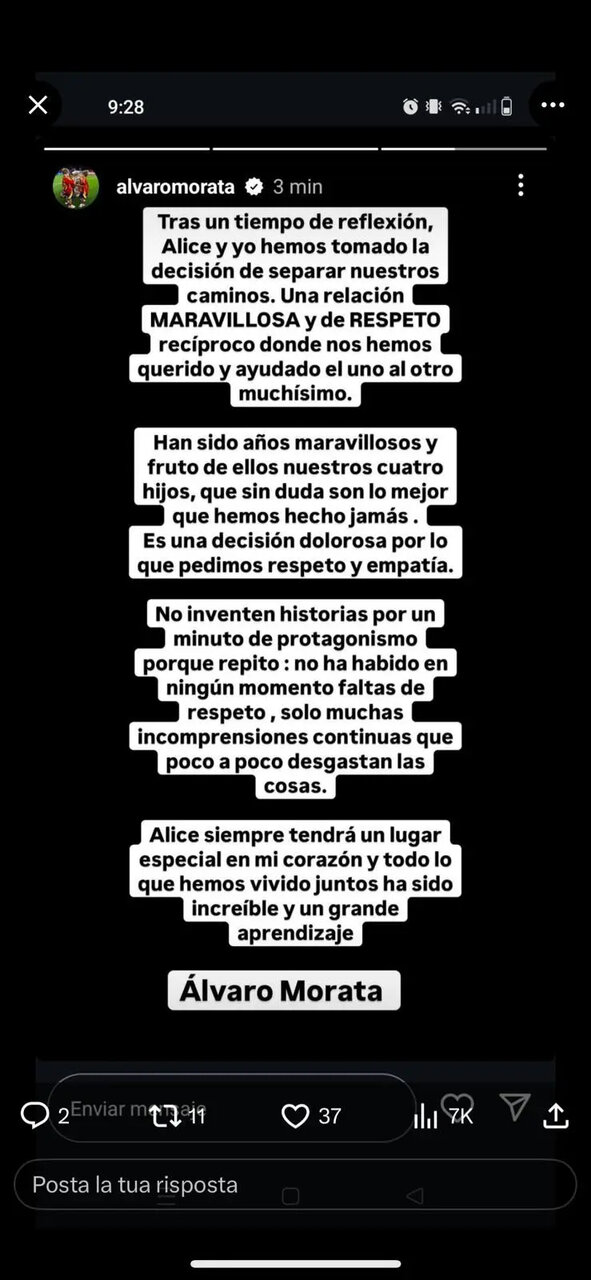 این خبر طرفداران و رسانه ها را شگفت زده کرد، زیرا به نظر می‌رسید این زوج بسیار عاشقانه زندگی می‌کنند و چهار فرزند داشتند: الساندرو، ادواردو لئوناردو و بلا. این زوج پس از پیروزی اسپانیا در یورو 2024 تعطیلات خود را با هم سپری کردند و موراتا سه روز پیش در یک کنفرانس مطبوعاتی به عنوان بازیکن جدید میلان معرفی شد.