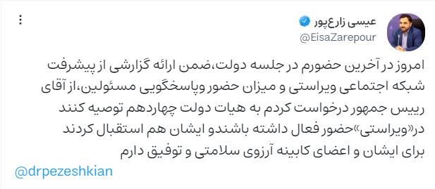 28 مرداد ماه در آخرین حضورم در جلسه دولت، ضمن ارائه گزارشی از پیشرفت شبکه اجتماعی ویراستی و میزان حضور و پاسخگویی مسئولین، از آقای رییس جمهور درخواست کردم به هیات دولت چهاردهم توصیه کنند در «ویراستی» حضور فعال داشته باشند و ایشان هم استقبال کردند، برای ایشان و اعضای کابینه آرزوی سلامتی و توفیق دارم.
