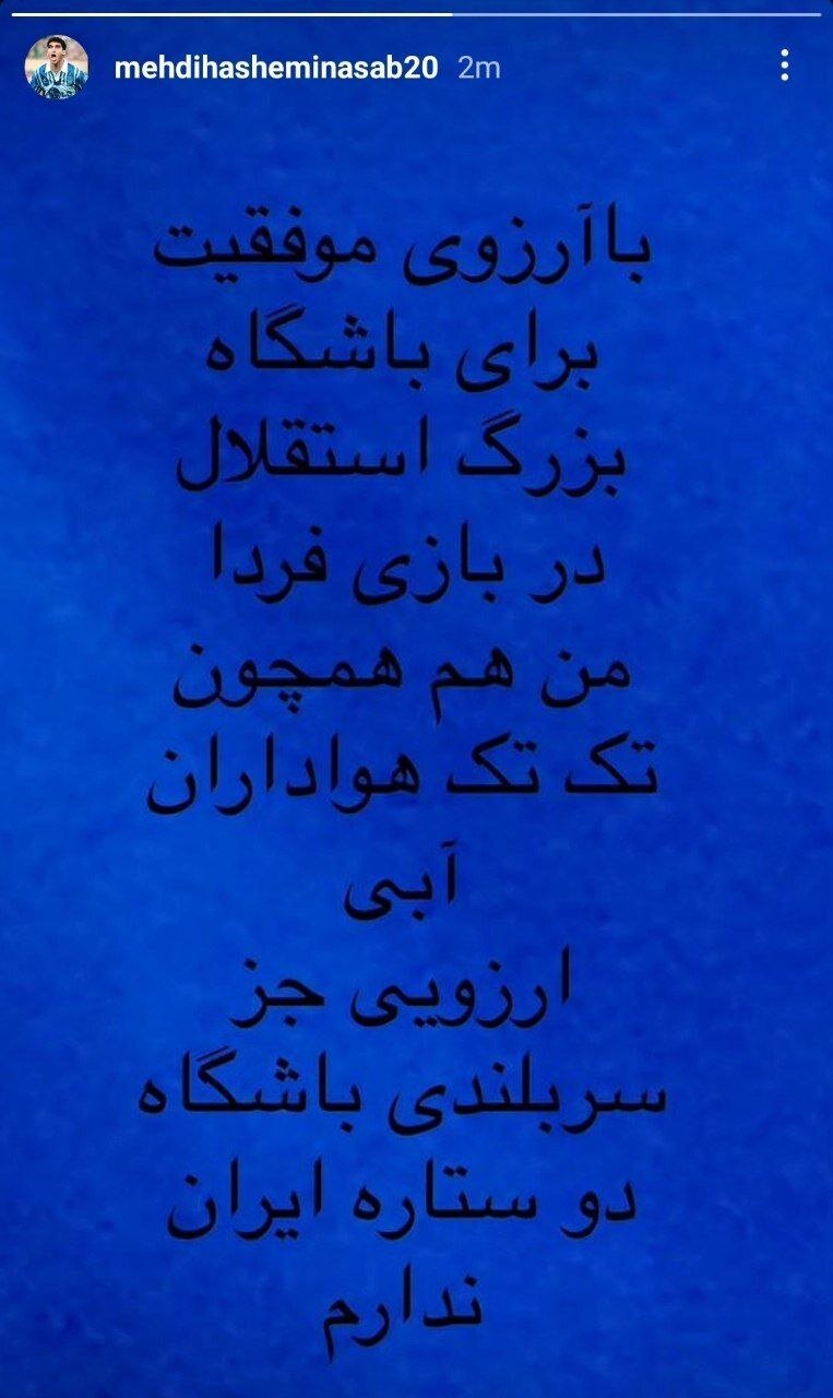 به گزارش سرویس وبگردی سیتنا، مهدی هاشمی نسب مربی فصل گذشته قبل با انتشار یک استوری در پیج شخصی خود برای استقلال آرزوی موفقیت کرد.