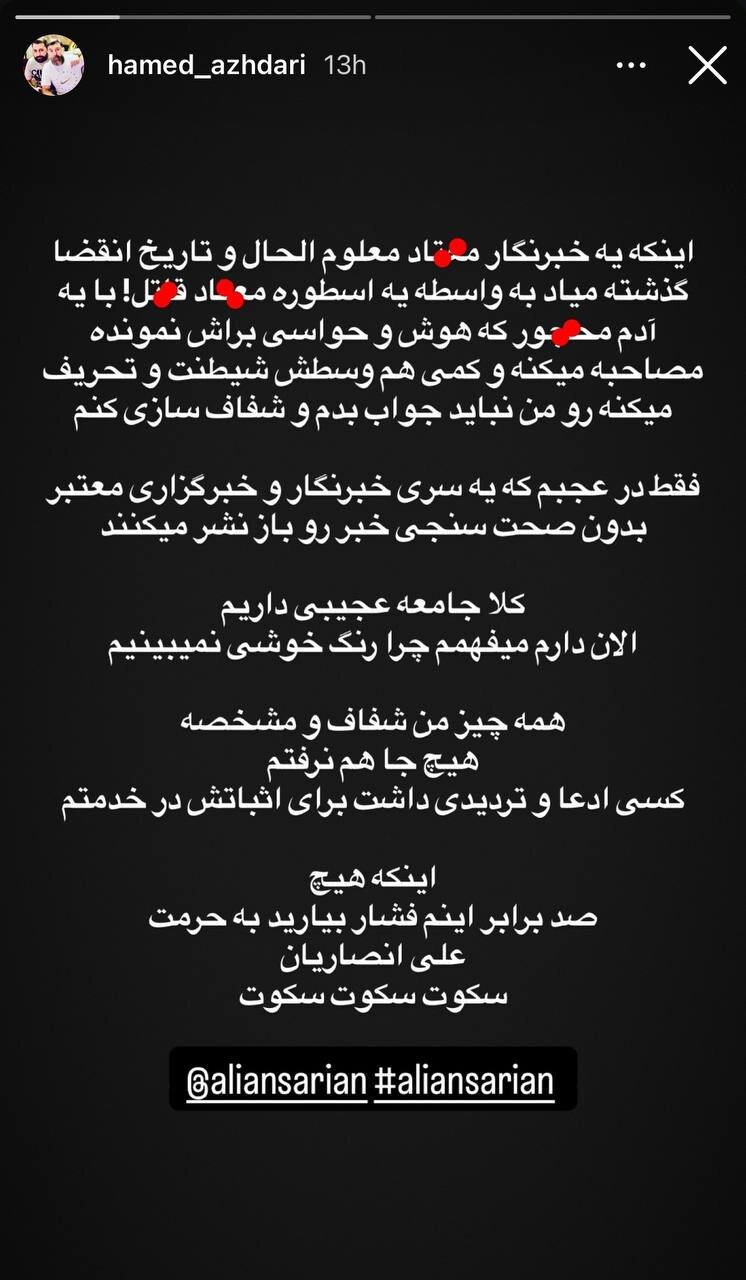 حامد اژدری، داماد خانواده انصاریان با انتشار یک استوری به حواشی اخیر واکنش نشان داد.