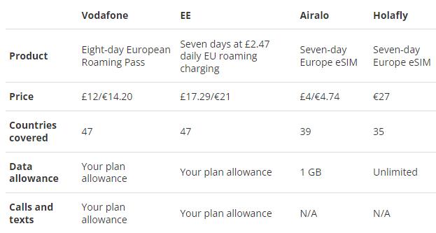 برای این که کمی از چند و چون هزینههای این خدمات در اروپا سر در بیاورید، هزینه رومینگ داده را در اروپا برای مدت یک هفته در جدول زیر مقایسه کردهایم، خدمتی که در اکثر مواقع پایینتر از خرید سیمکارتهای الحاقی است.