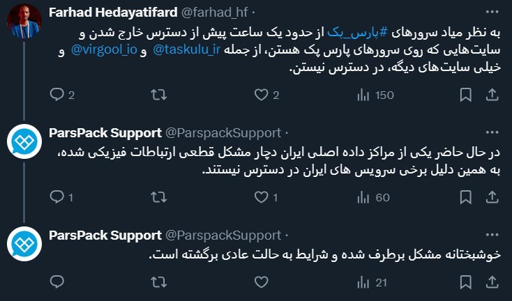 پشتیبانی پارسپک که در شبکه اجتماعی ایکس از بروز اختلال خبر داده بود، در توئیتی مشکل در یکی از مراکز داده اصلی ایران را علت اختلال اینترنتی برشمرده بود و حال در توئیت جدیدی از برطرف شدن مشکل خبر داده است.