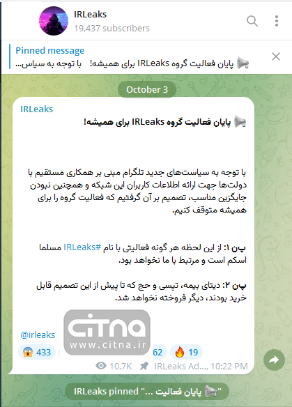 گروه هکری آیآر لیکس (IRLeaks)، اعلام کرد: با توجه به سیاستهای جدید تلگرام مبنی بر همکاری مستقیم با دولتها جهت ارائه اطلاعات کاربران این شبکه و همچنین نبودن جایگزین مناسب، تصمیم بر آن گرفتیم که فعالیت گروه را برای همیشه متوقف کنیم.