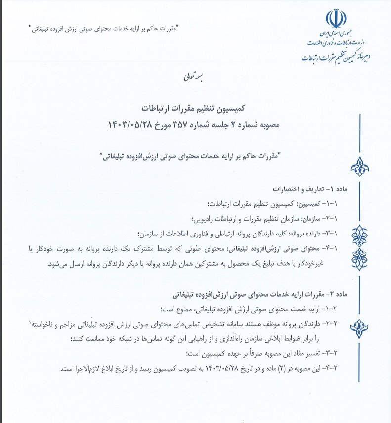 بر اساس مصوبه اخیر کمیسیون تنظیم مقررات ارتباطات رادیویی ارائه خدمت محتوای صوتی ارزش افزوده تبلیغاتی، ممنوع است.
