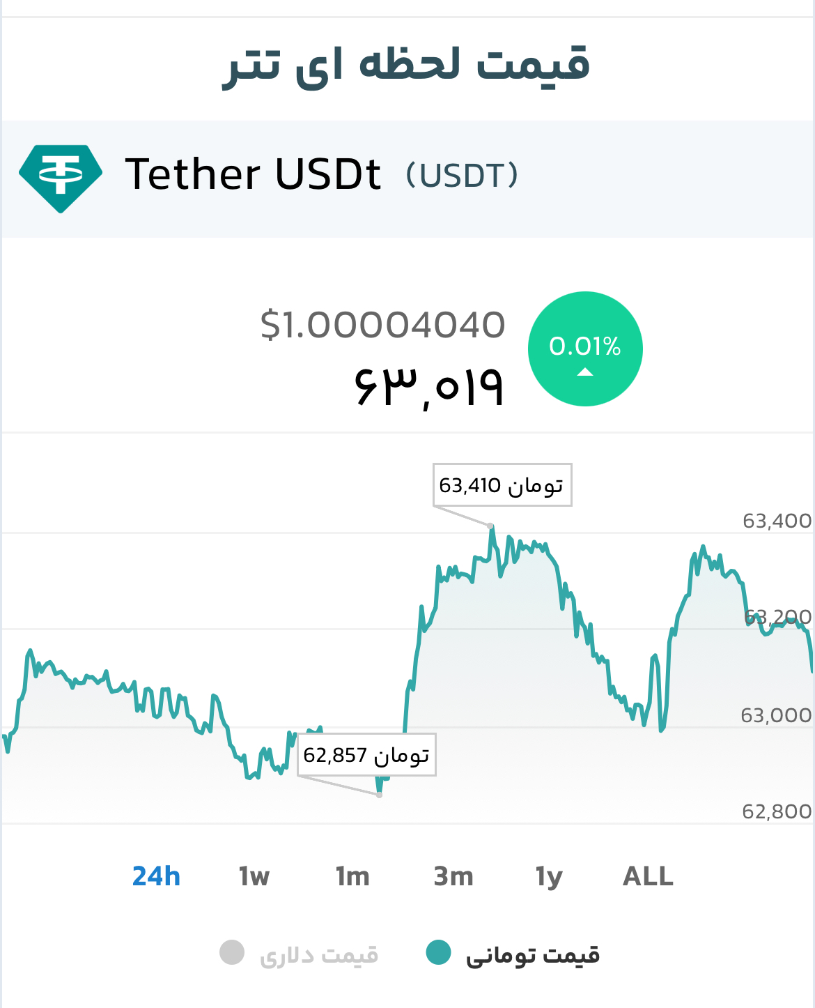 قیمت تتر در زمان انتشار این خبر (حوالی نیمه شب دوشنبه) تا ۶۳.۰۰۰ تومان کاهش یافته است.