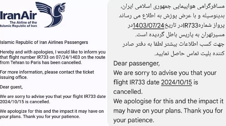 متن پیامکها بدین شرح بود: «مسافر گرامی هواپیمایی جمهوری اسلامی ایران، بدینوسیله و با عرض پوزش به اطلاع میرساند پرواز شماره ... در تاریخ ... در مسیر ... باطل گردیده است.»