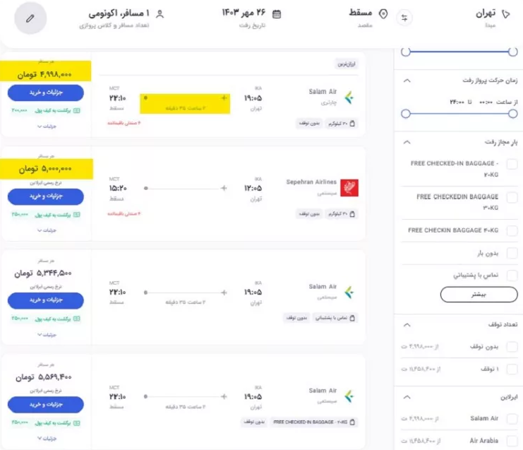 نتیجه این بررسی نشان میدهد که ارزانترین بلیت در تاریخ ۱۷ اکتبر (۲۶ مهر ماه) ۵ میلیون تومان (۷۳ یورو) و با مدت زمان تقریبی ۳ ساعت است که با هواپیمایی عمانی سلام ایر یا ایرانیِ سپهران ایرلاین انجام میشود.