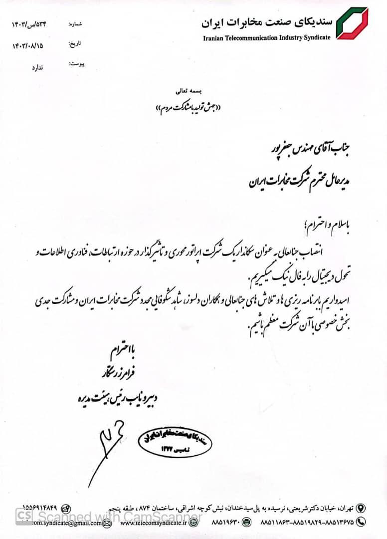 امیدورایم با برنامه ریزی ها و تلاش های جنابعالی و همکاران دلسوز، شاهد شکوفایی مجدد شرکت مخابرات ایران و مشارکت جدی بخش خصوصی با آن شرکت معظم باشیم.
