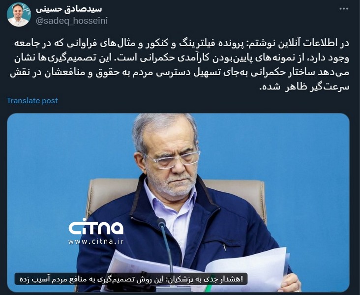 به گزارش سیتنا، سیدصادق حسینی، فعال رسانهای در شبکه اجتماعی ایکس، آورده است: