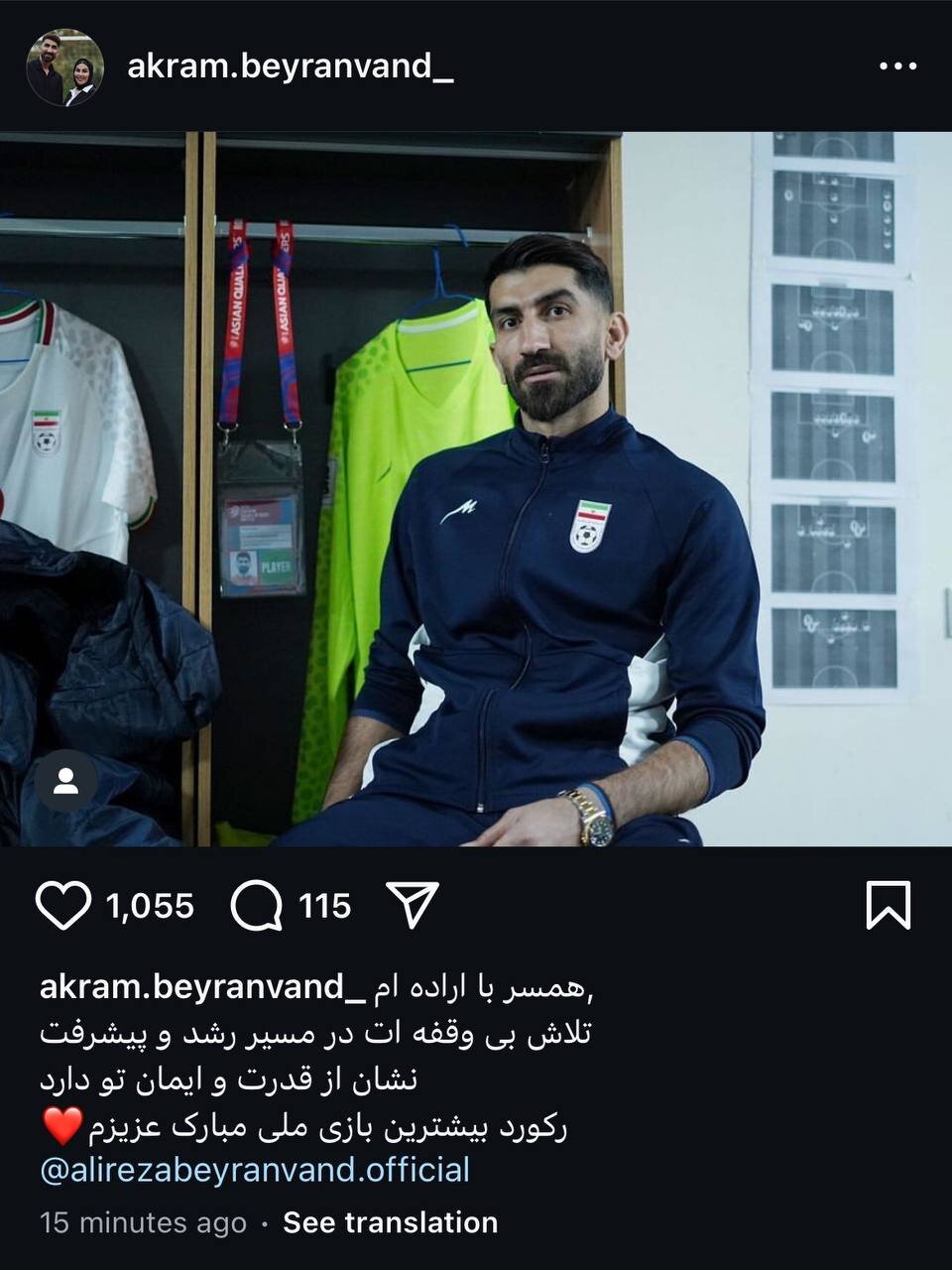 همسر علیرضا بیرانوند پستی برای دروازهبان شماره یک تیم ملی ایران منتشر کرد.