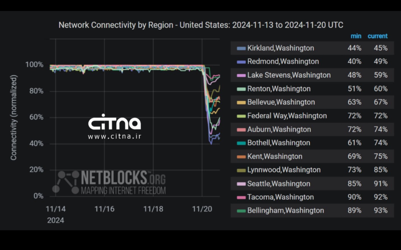 معیارها از کاهش شدید اتصال به اینترنت در بخشهایی از ایالت واشنگتن آمریکا خبر میدهند که کرکلند، ردموند و رنتون در میان بیشترین آسیبها قرار دارند.