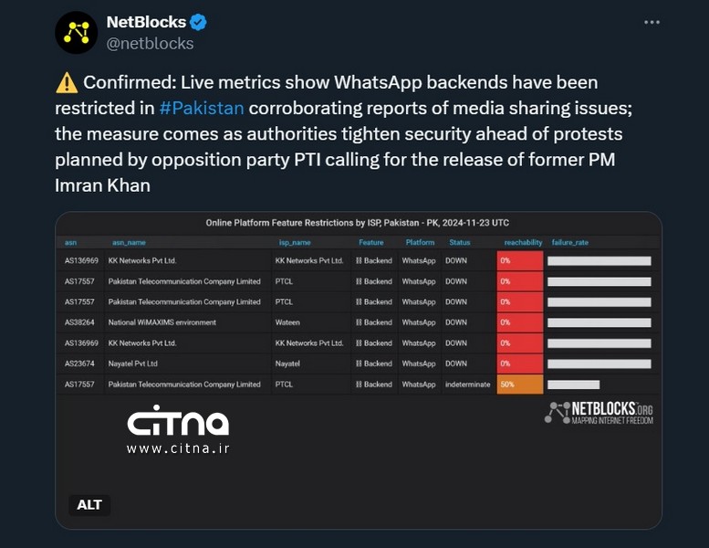 به گزارش سیتنا، به استناد گزارش نت بلاکس، پشتیبانهای واتساپ در پاکستان محدود شدهاند و نمودارها گزارشهای مربوط به مشکلات اشتراکگذاری رسانه را تأیید میکنند.