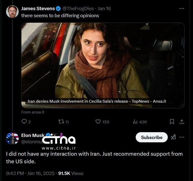 در حالی که ایتالیا هر گونه مداخله ایلان ماسک در مذاکرات میان ایتالیا و ایران برای آزادی چچلیا سالا، روزنامهنگار ایتالیایی زندانی در تهران را رد میکند، خود ماسک میگوید که در این رابطه «نقش کوچکی» داشته است.